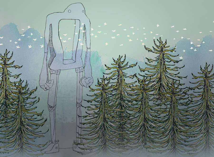 Robot in Redwoods 2017 pen, photoshop